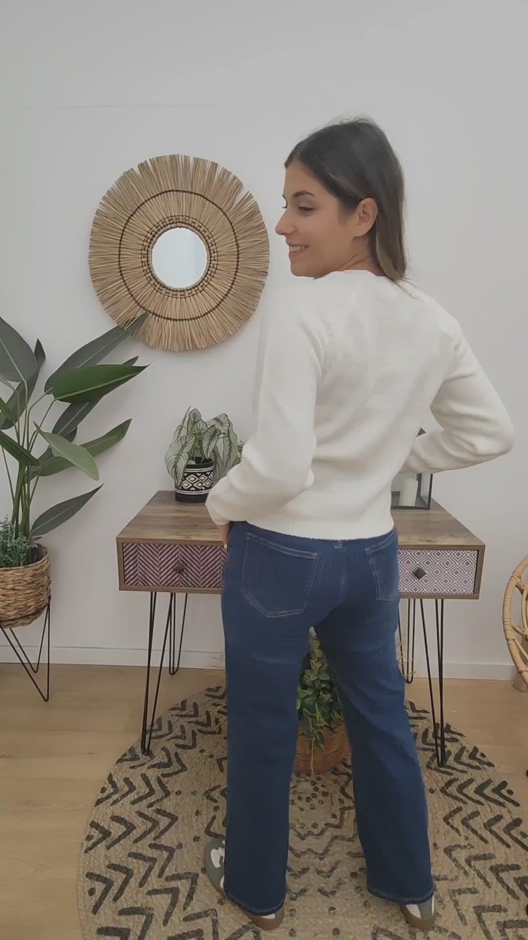 Pantalón vaquero de tiro alto y pierna ancha con detalle de tres botones dorados en las caderas y dos bolsillos. Cierre mediante botón y cremallera. Tiene dos bolsillos traseros.