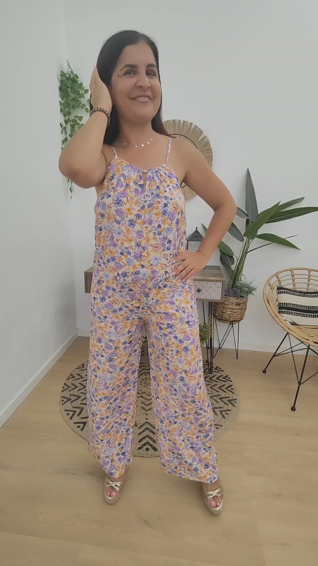 Mono largo de pernera ancha y con un bonito estampado de flores en tonos morados y amarillas. Tiene la espalda abierta y y unos tirantes que ajustan mediante lazada.