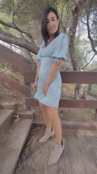 Vestido estampado de flores con ecote pico y botones decorativos. Manga abullonada elástica acabada con un lazo. Cierre con cremallera en la parte izquierda.Tela ligera agradable.