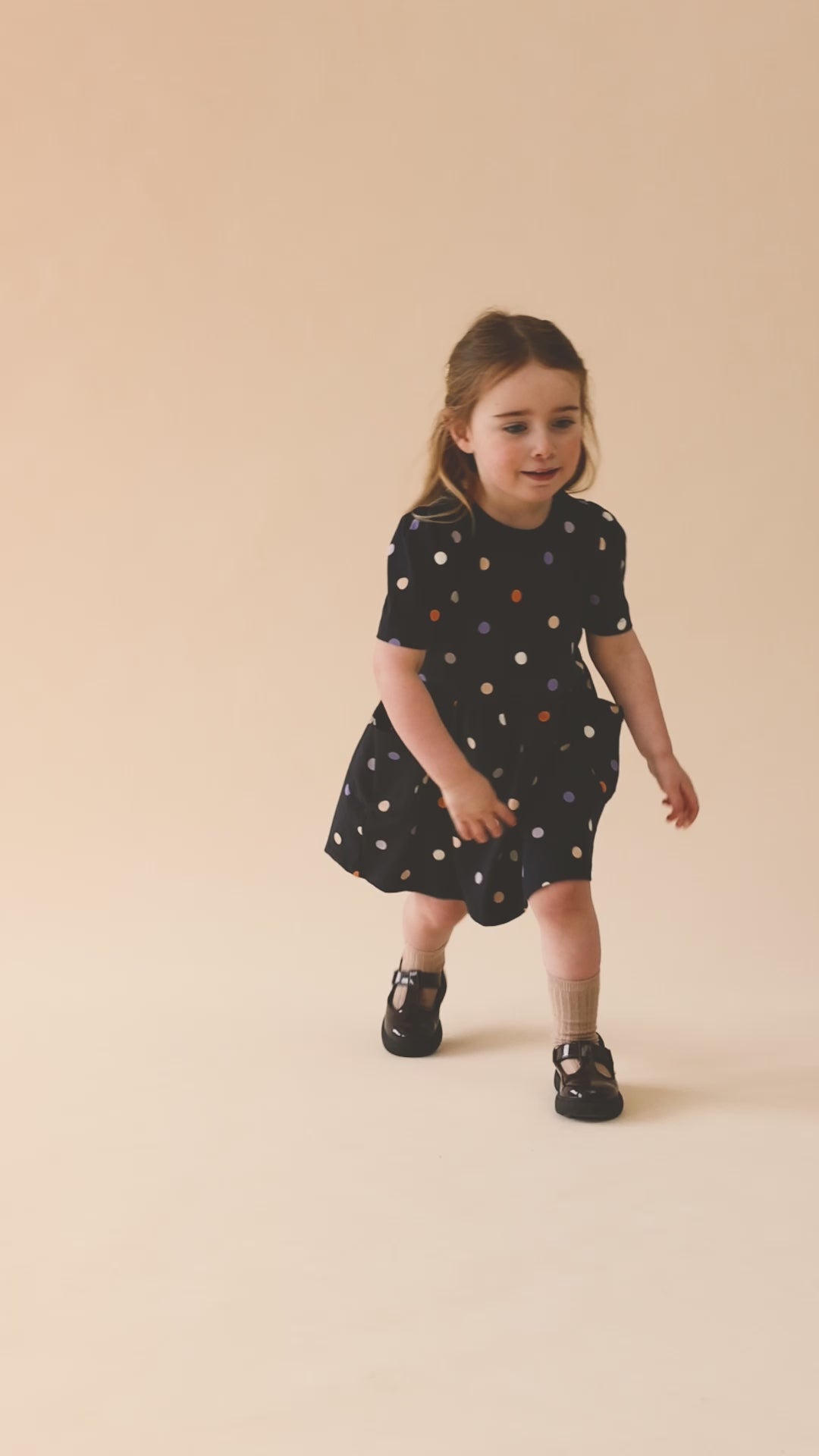 Vestido de niña de manga corta de cuello redondo cortado en la cintura acabado en volantes.